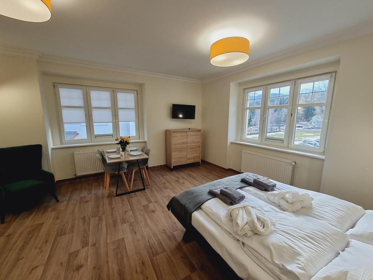 Pokój Czteroosobowy. Jest to pokój czteroosobowy z jadalnią, szafą oraz łazienką z kabiną prysznicową i suszarką do włosów. Udogodnienia obejmują telewizor z płaskim ekranem, czajnik elektryczny oraz ogrzewanie. Podłoga wyłożona jest wykładziną. Z okien roztacza się widok na góry. W tej opcji zakwaterowania do dyspozycji gości są 3 łóżka. Pokój Czteroosobowy - 4 osobowy. Powierzchnia pokoju ok.: 40 mkw. ;