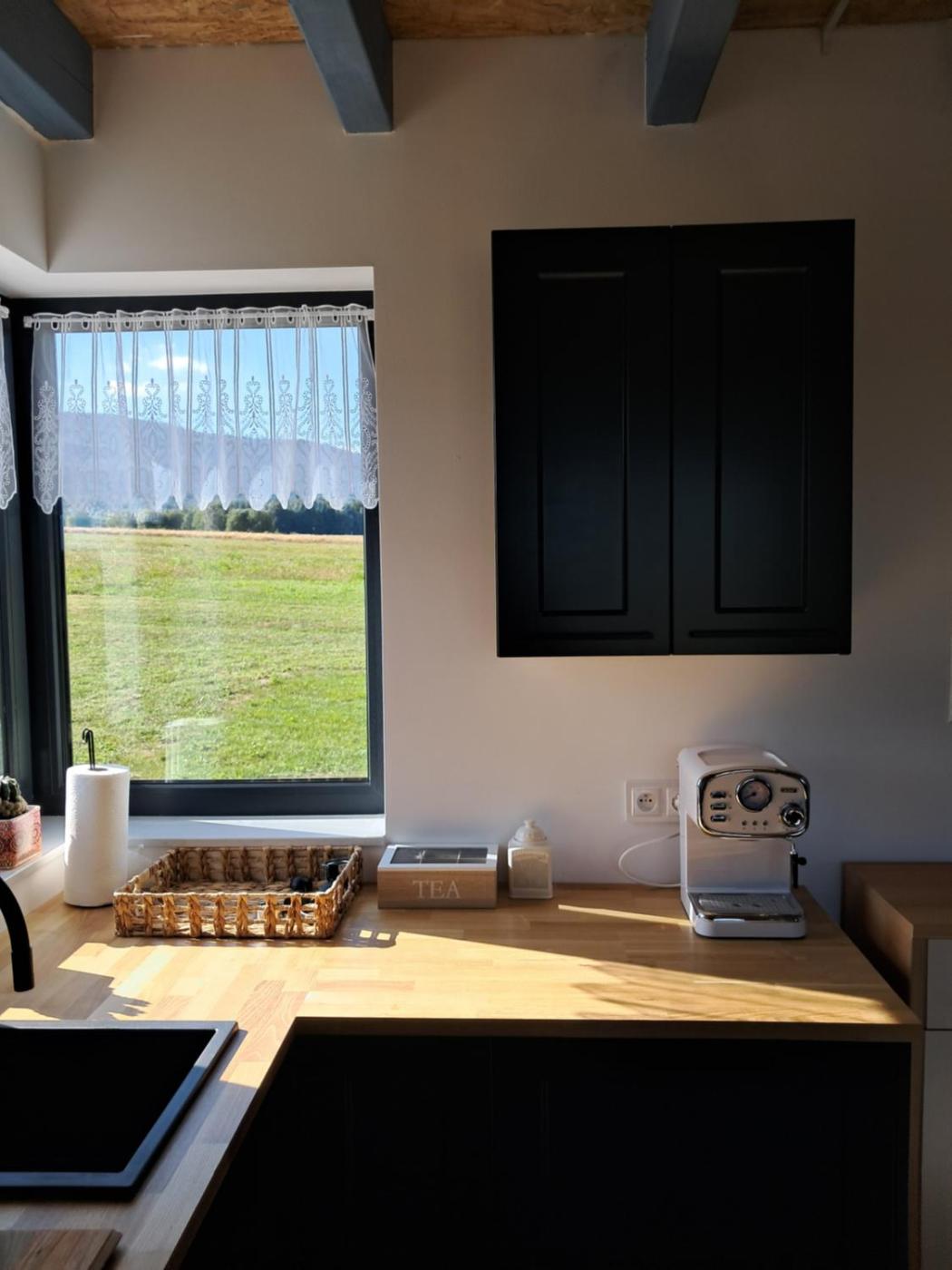 W domku do dyspozycji gości przygotowano taras, sypialnię (1), salon oraz kuchnię z doskonałym wyposażeniem, w tym lodówką i zmywarką. W domku zapewniono ręczniki i pościel.