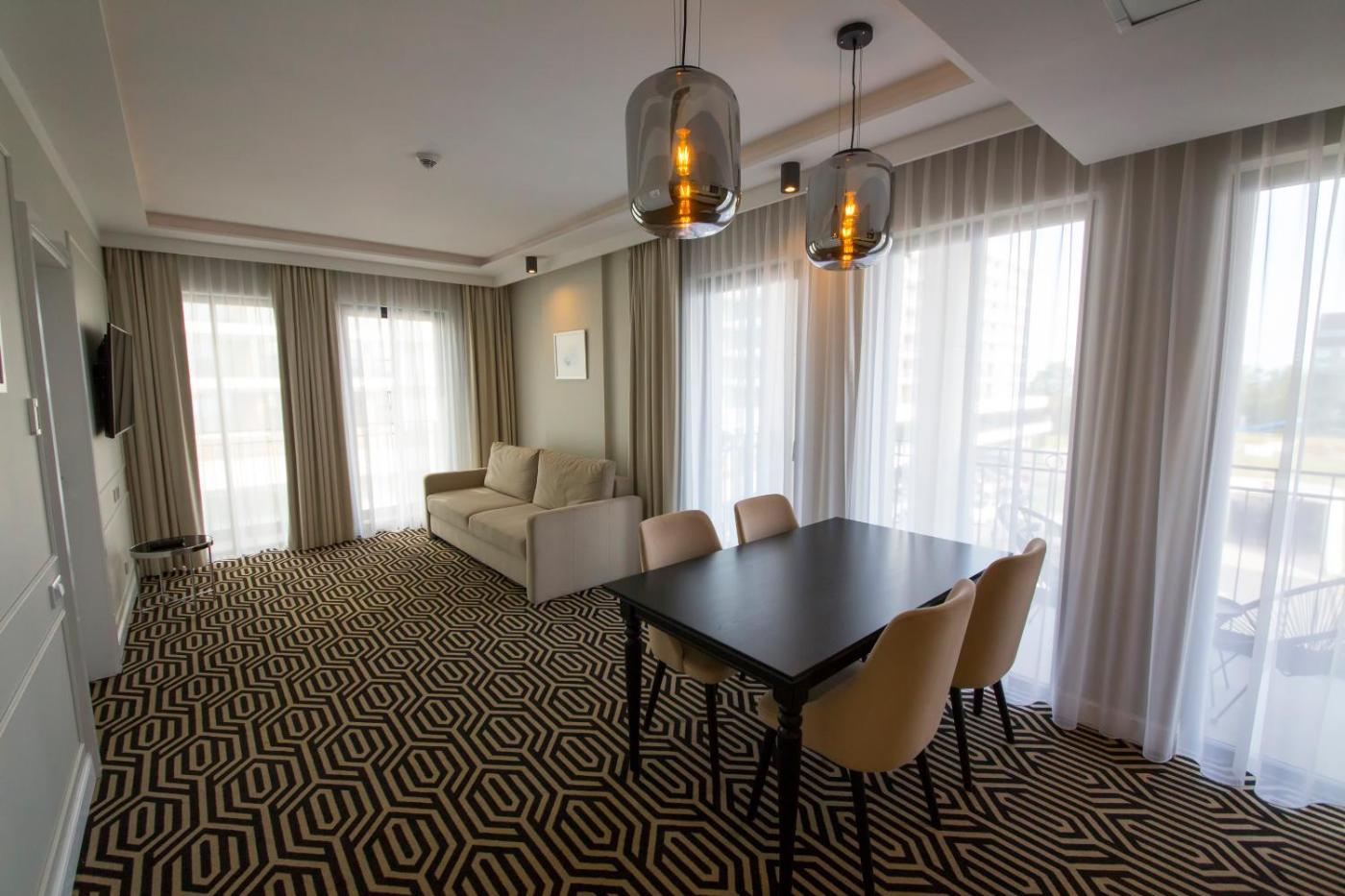 Każda opcja zakwaterowania ma balkon i wyposażona jest w telewizor z płaskim ekranem oraz pralkę. We wszystkich opcjach znajduje się aneks kuchenny z pełnym wyposażeniem, w tym lodówką, jak również część wypoczynkowa z rozkładaną sofą oraz prywatna łazienka z prysznicem i bezpłatnym zestawem kosmetyków. Wyposażenie obejmuje także zmywarkę, płytę kuchenną, toster, ekspres do kawy i czajnik.